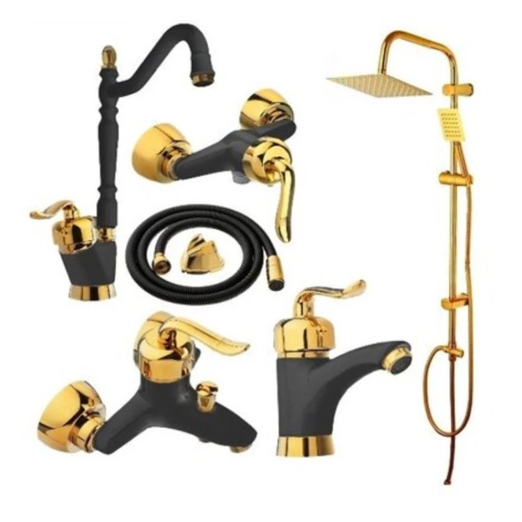 ست ۶ تیکه شیرآلات قاجاری مشکی طلایی به همراه علم دوش دوکاره مربع طلایی و شیلنگ توالت ریز بافت مشکی طلایی