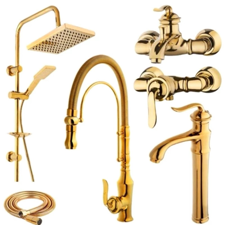 شامل : 1عدد شیر روشویی پایه بلند - 1عدد شیر آفتابه - 1عدد شیر دوش - 1عدد شیر ظرفشویی فنری - 1عدد علم دوش دوکاره مربع طلایی - 1عدد شیلنگ توالت طلایی