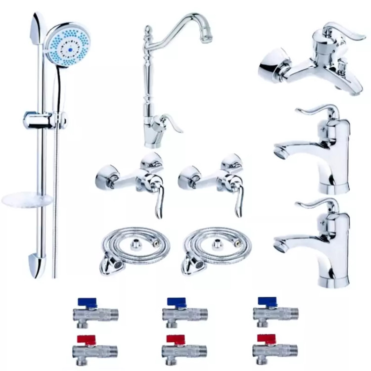 شامل : ۲عدد شیر روشویی - ۲عدد شیر آفتابه - ۲ عدد شیلنگ توالت - ۱ عدد علم دوش تک کاره - ۱عدد شیر دوش - ۱عدد شیر ظرفشویی - ۶ عدد شیر صافی دار سایز ۳.۸