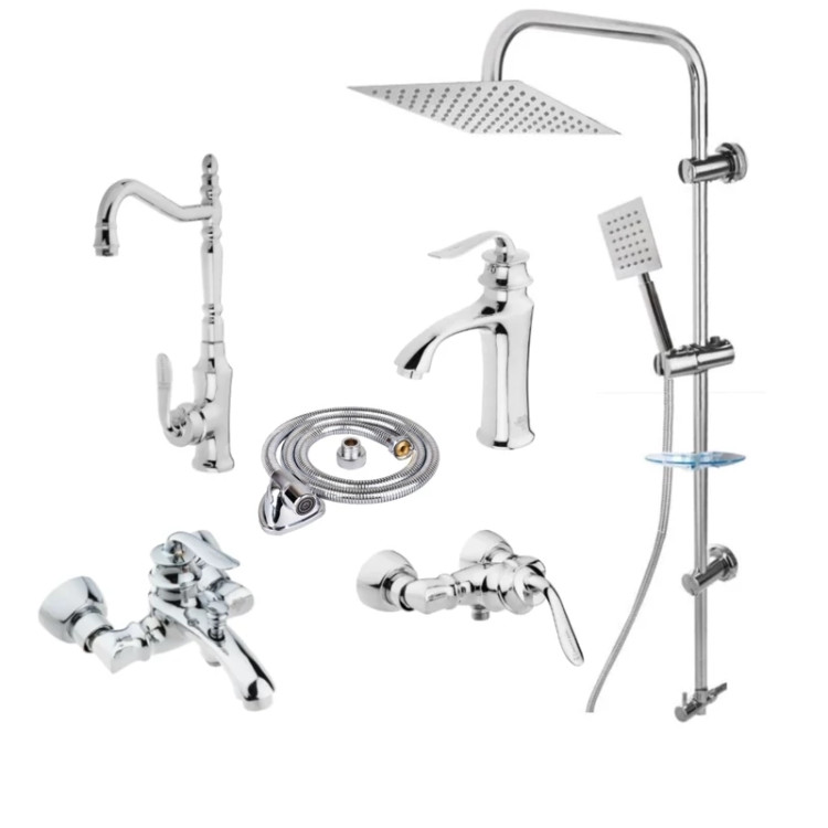 شامل: ۱عدد شیر روشویی-۱عدد شیر ظرفشویی-۱عدد شیر دوش - ۱عدد شیر آفتابه - ۱عدد علم دوش دوکاره مربعی - ۱عدد شیلنگ توالت ریز بافت