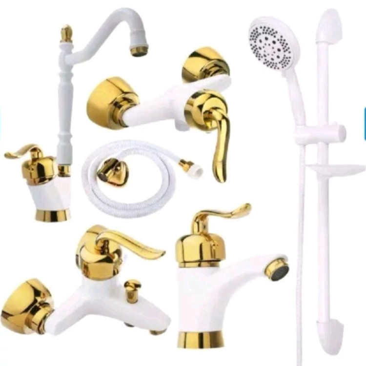 ست 6 تایی شیرآلات قاجاری سفید طلایی با علم دوش تک کاره سفید(پس کرایه)