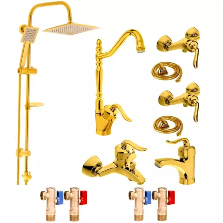 شامل : ۲ عدد شیر آفتابه - ۲عدد شیلنگ آفتابه - ۱عدد شیر دوش - ۱عدد شیر ظرفشویی - ۱عدد شیر روشویی- ۴ عدد شیر صافی دار سایز ۳.۸ برنجی - ۱عدد علم دوش دوکاره طلایی