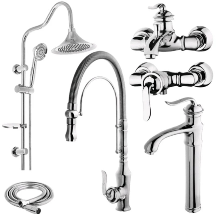 ست 6 تایی شیرآلات هلن کروم با شیر ظرفشویی فنری و شیر روشویی پایه بلند و علم دوش شیپوری و شیلنگ توالت (پس کرایه)