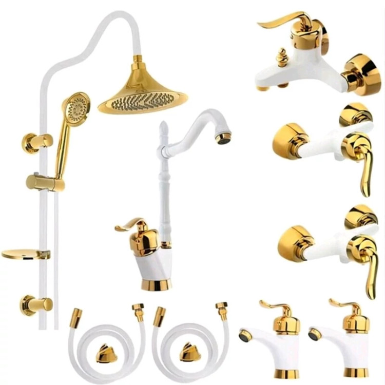 ست 9 تایی شیرآلات قاجاری سفید طلایی با علم دوش دوکاره شیپوری و شیلنگ توالت