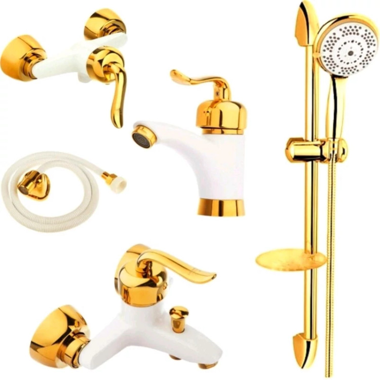 شامل : ۱عدد شیر روشویی- ۱عدد شیر آفتابه- ۱عدد شیر دوش - ۱عدد علم دوش تک کاره طلایی - ۱عدد شیلنگ توالت سفید طلایی