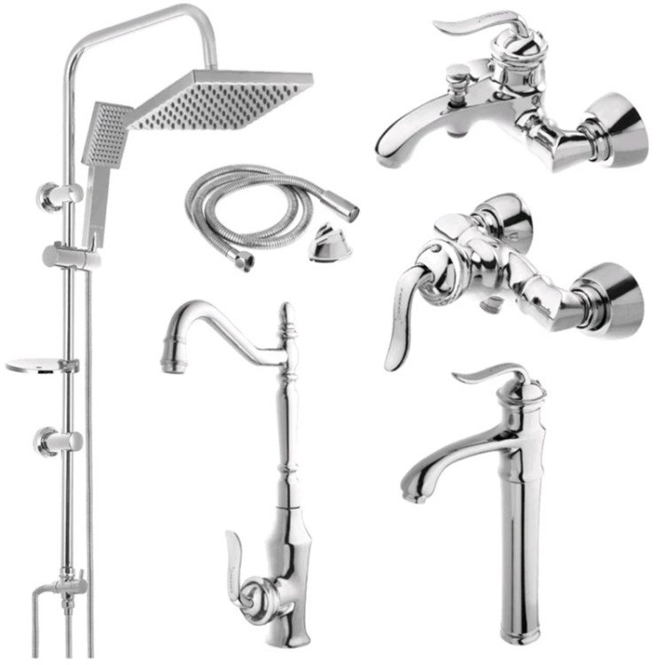 شامل : 1عدد شیر روشویی پایه بلند- 1عدد شیر آفتابه - 1عدد شیر دوش - 1عدد شیر ظرفشویی - 1عدد علم دوش دوکاره مربع کروم - 1عدد شیلنگ توالت کروم