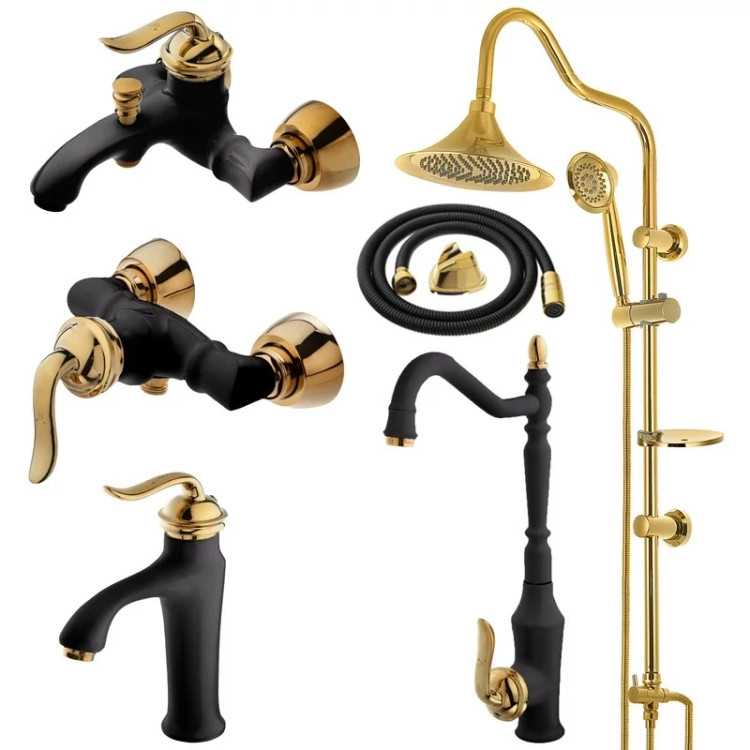 ست 6 تایی شیرآلات هلن مشکی طلایی و علم دوش شیپوری و شیلنگ توالت (پس کرایه)