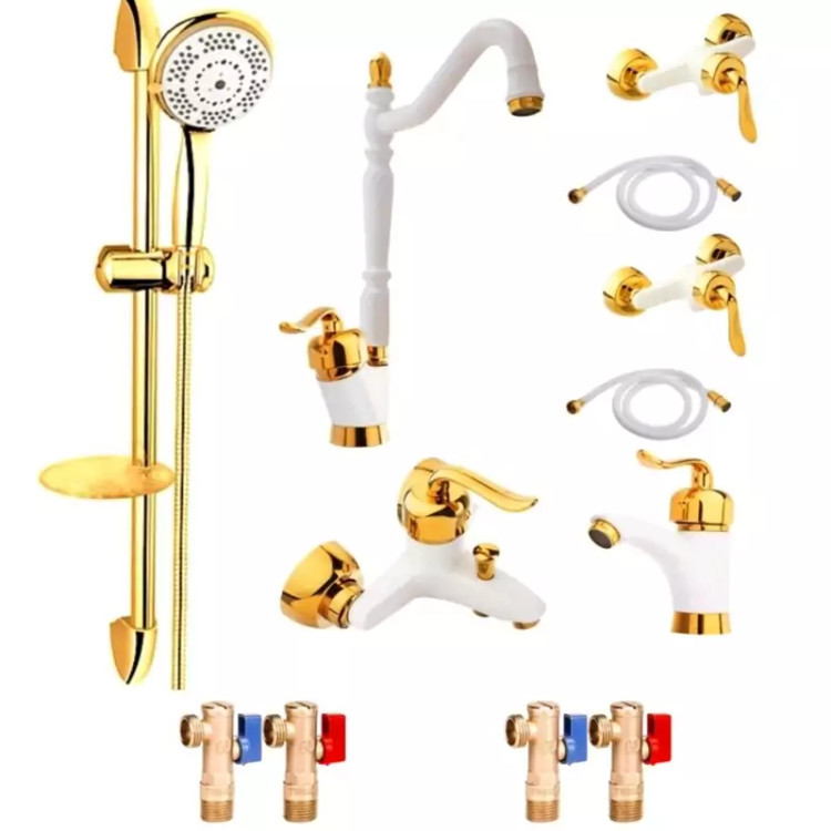 شامل : ۲ عدد شیر آفتابه - ۲عدد شیلنگ آفتابه - ۱ عدد شیر ظرفشویی- ۱عدد شیر روشویی-۱عدد شیر دوش - ۴ عدد شیر صافی دار سایز ۳.۸ برنجی - ۱ عدد علم دوش تک کاره طلایی