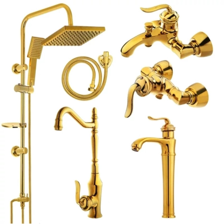 شامل : 1عدد شیر روشویی پایه بلند - 1عدد شیر آفتابه - 1عدد شیر دوش - 1عدد شیر ظرفشویی - 1عدد علم دوش دوکاره مربع طلایی - 1عدد شیلنگ توالت طلایی